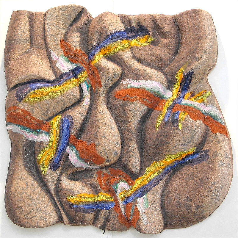 En 2005 j’utilise, comme support, des reliefs de faible épaisseur obtenus par moulage, faits de toile et de résine. La technique du moulage permet de produire plusieurs exemplaires de topographies 3D identiques. Ces reliefs sont conçus préalablement à l’aide de logiciels d’image de synthèse, l’intention première étant de faire réaliser ensuite industriellement ces moulages par des fraiseuses à commandes numériques à partir des fichiers 3D calculés sur ordinateur. Le coût élevé du fraisage, en rapport avec les dimensions importantes des formes, m’amène à renoncer à associer production industrielle et production artistique. La forme est sculptée à la main dans des blocs de béton allégé, à partir de visuels du modèle numérique. Sur les topographies moulées, j’interviens picturalement dans un champ « lié à la conduite du peintre plus qu’à sa vision du monde, à sa main plutôt qu’à son œil ». Le geste, la trace, la tache, la coulure, la griffure et toutes les autres activités instauratrices, contraintes par le relief, s’agencent en accord ou en opposition avec les accidents du terrain.